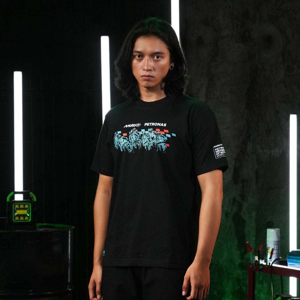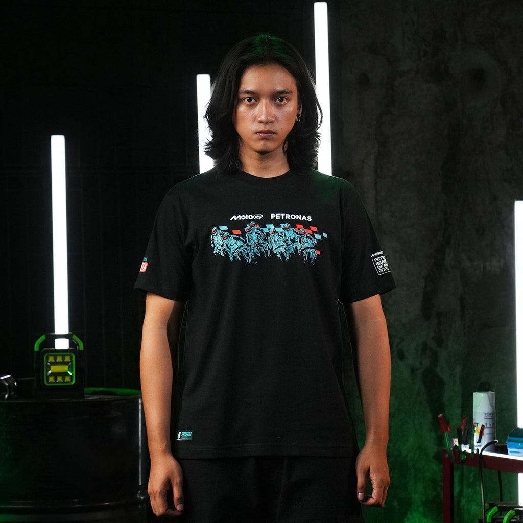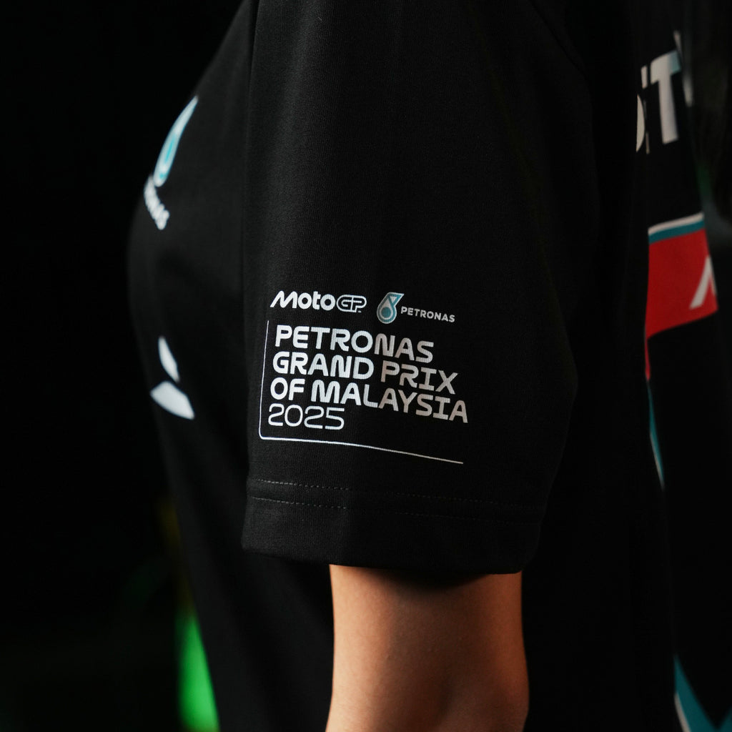 The PETRONAS MotoGP 2025 Custom Tee is made from 70% cotton and 30% polyester (210gsm). The front features MotoGP, PETRONAS and MotoGP rider's graphics, while the back showcases #SPEEDPHORIA and space for a personalised name and number. The right sleeve displays the Sprinta logo, and the left sleeve highlights “PETRONAS GRAND PRIX OF MALAYSIA 2025”.