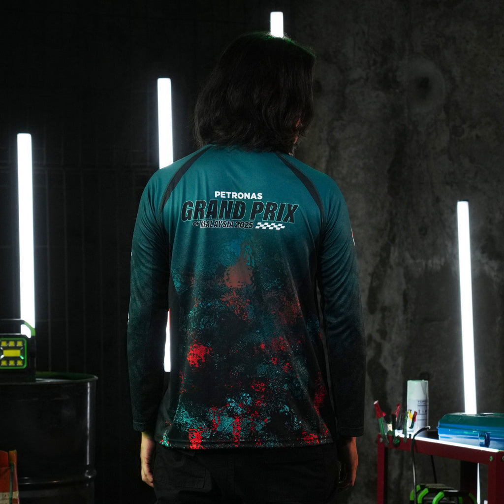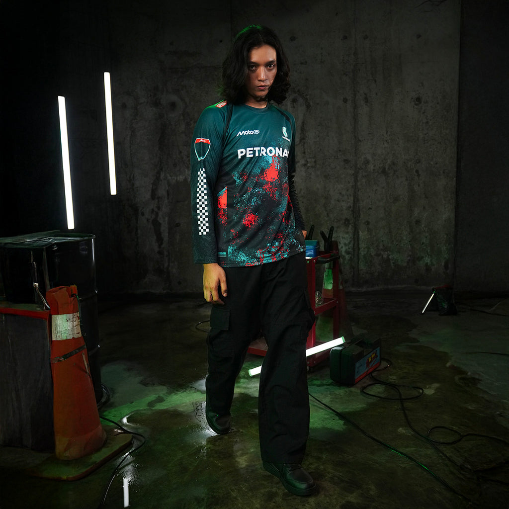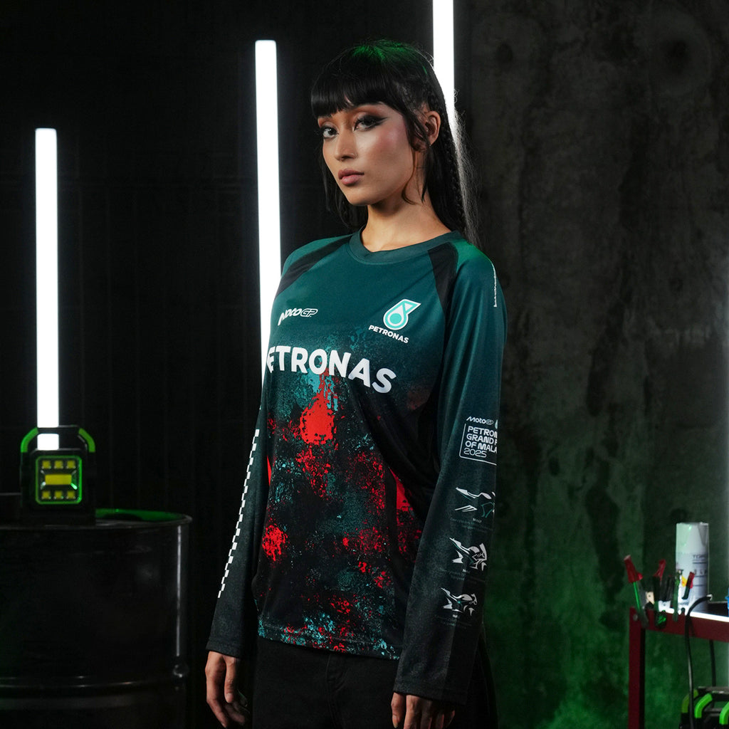 The PETRONAS MotoGP Rubicon Long Sleeve Jersey features full sublimation printing with vibrant, long-lasting graphics. The front showcases the PETRONAS and MotoGP logos, while the back highlights “PETRONAS GRAND PRIX OF MALAYSIA 2025”. The left sleeve displays three motorcycles representing the MotoGP categories, and the right sleeve features a race flag with space for personalised numbers.