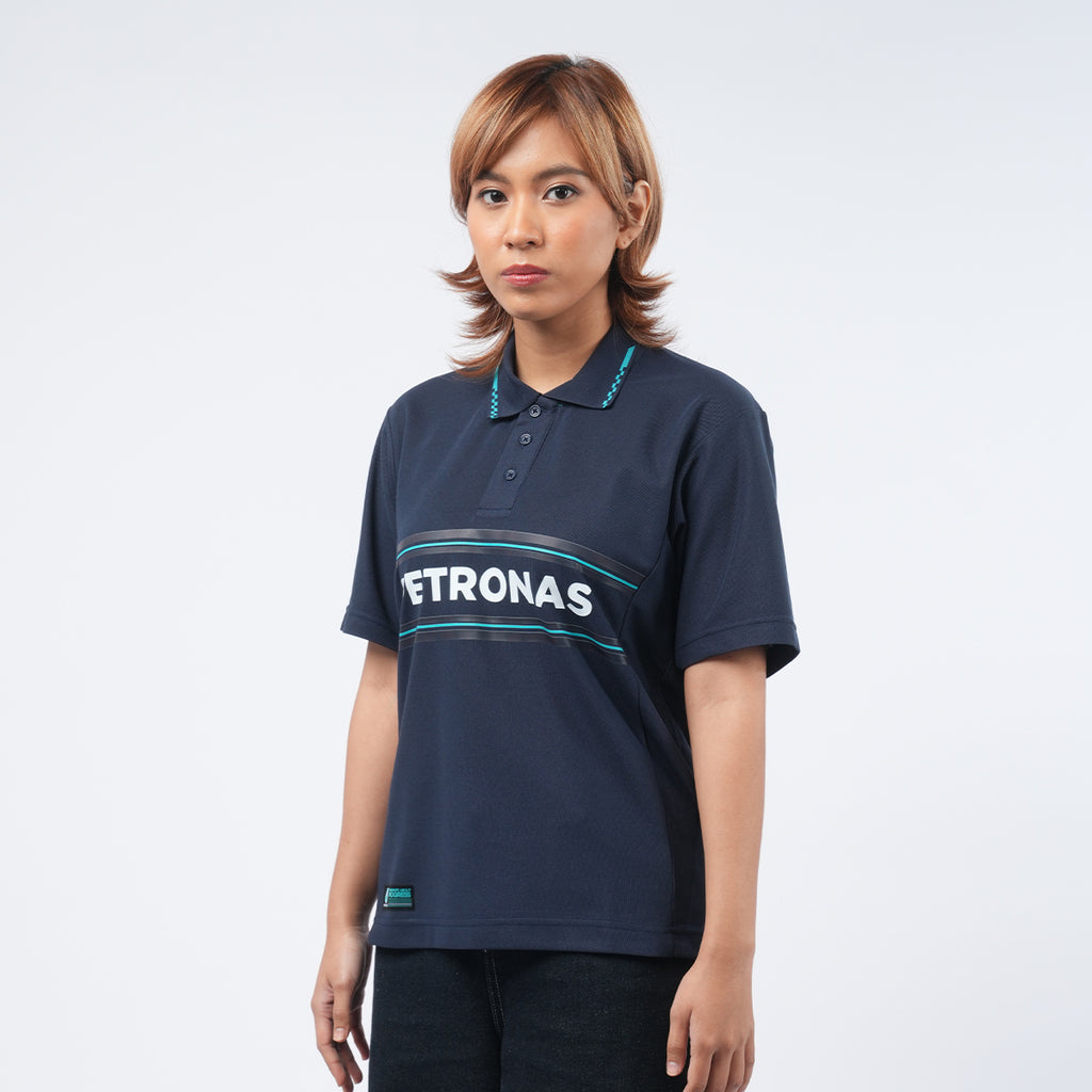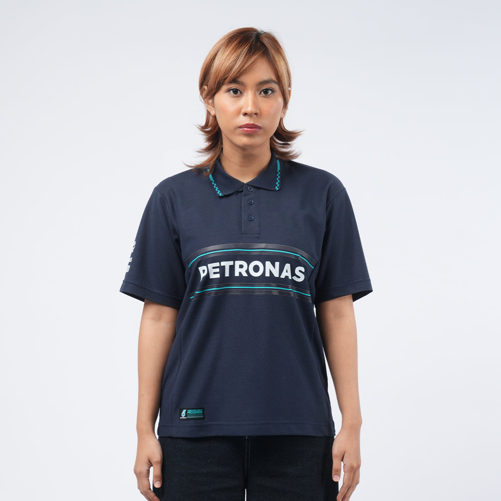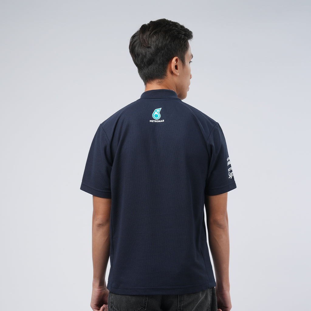 PETRONAS Polo Motorsport Navy combines sophisticated style with superior comfort and durability. Made from premium Dry-Fit material (220gsm), it features a regular fit that provides a clean and structured look. The buttoned collar adds an elegant touch, while the fine lines on the collar enhance its stylish design. With the PETRONAS logo on the back, PETRONAS lettering on the front, and "PETRONAS PRIMAX and PETRONAS SYNTIUM" lettering on the sleeves, this polo reflects a dynamic and exclusive identity.