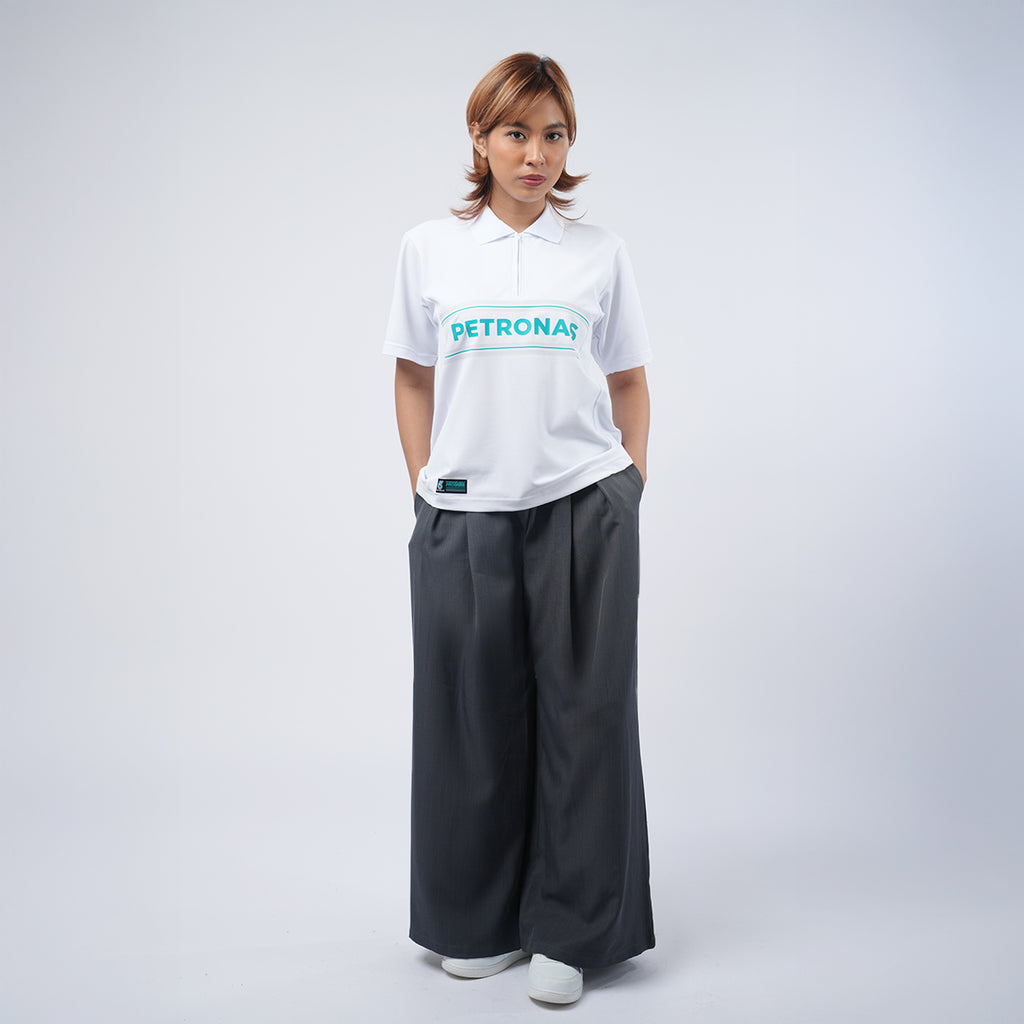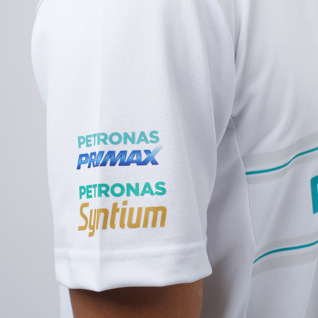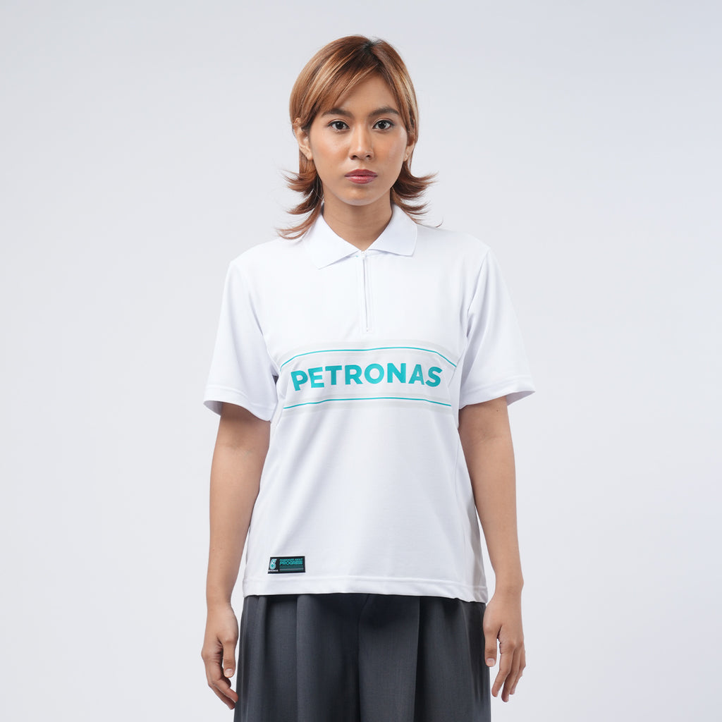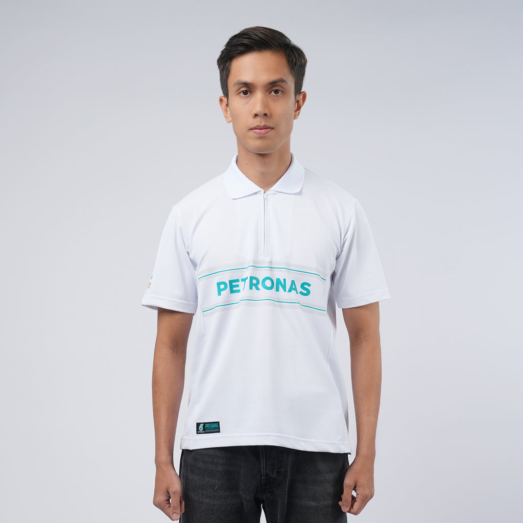 PETRONAS Polo Motorsport White combines sophisticated style with superior comfort and durability. Made from premium Dry-Fit material (220gsm), it features a regular fit that provides a clean and structured look. The zipper collar adds an elegant touch, while the fine lines on the collar enhance its stylish design. With the PETRONAS logo on the back, PETRONAS lettering on the front, "PETRONAS PRIMAX and PETRONAS SYNTIUM" lettering on the sleeves, this polo reflects a dynamic and exclusive identity.