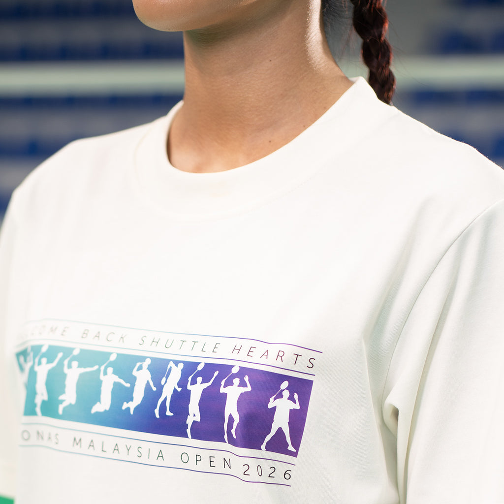 The PMO2026 Tee Jump Smash captures the energy, agility, and excitement of badminton in a sleek, modern design. Crafted from a soft and breathable blend of 70% cotton and 30% polyester (210gsm), it provides all-day comfort for both casual wear and active play. Presented in a clean off-white tone that adds a subtle, premium touch, this tee features a welcoming message on the front alongside a vibrant illustration of a player performing a jump smash symbolising the power, speed, and intensity of the sport. On the back, bold “PETRONAS MALAYSIA OPEN 2026” lettering proudly represents the event. The BWF logo on the right sleeve and the BAM logo on the left complete the look, making this tee a stylish way to show support for Malaysian badminton.