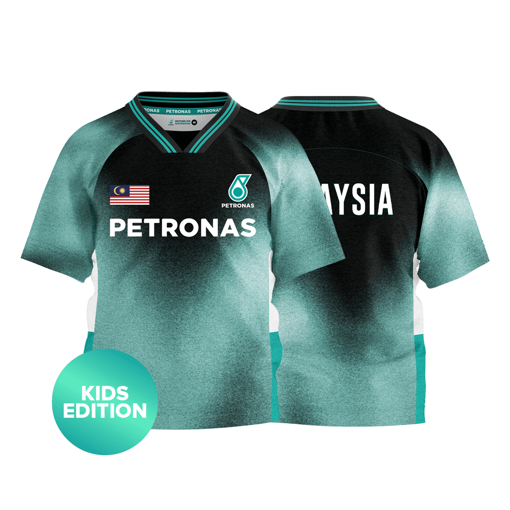 The Shuttlehearts Thrust Kids Jersey captures the perfect balance of performance, pride, and sleek design. Featuring a powerful teal-to-black gradient that symbolizes energy and momentum, it creates a striking look that stands out both on and off the court. Designed with a V-shaped ribbed collar and a comfortable regular fit, this jersey offers a sharp, athletic silhouette. Made from lightweight 160gsm Dry-Fit Interlock fabric using full sublimation printing, it provides exceptional breathability, flexibility, and long-lasting color. The front proudly displays the Malaysian flag and a Hi-Dent DTF PETRONAS logo, while the back features a bold “MALAYSIA” print, a true mark of national spirit and high-performance style.
